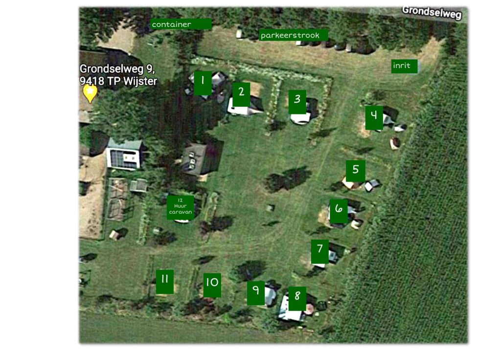 Plaats 12 wordt bezet door de huurcaravan en plaats 11 dit jaar door seizoengasten.