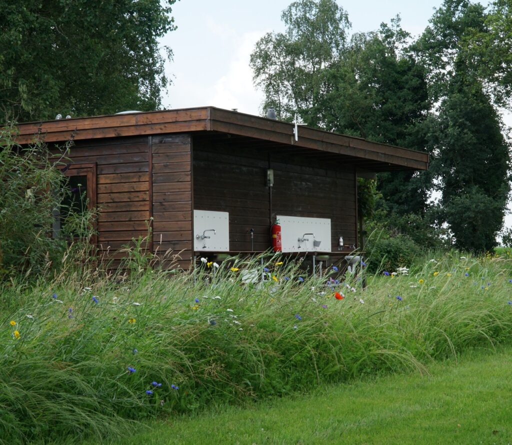 Ons sanitairgebouw is van hout aan de buitenkant want dat past in de omgeving. U vindt hierin drie toiletten en de uitstort voor uw eigen toilet en afvalwater aan de noordkant. Aan de buitenkant twee afwasplaatsen met warm en koud water, een plaats waar u uw jerrycan kunt vullen en een fonteintje om uw handen te wassen. Aan de derde kant is de ingang voor de wasgelegenheid. Hier zijn twee wastafels, een wascabine (tevens babybadje en aankleedtafel) en drie douches waarvan één dubbel uitgevoerd. Voor de koudere dagen is de wasgelegenheid voorzien van vloerverwarming.